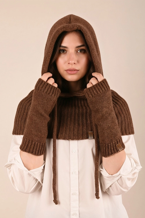 Vivisence Women Winter Hood And Gloves Set Merino Wool Knit Warm And Cozy, Brown