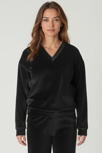 Vivisence Women Sweatshirt Velour V Neck Long Sleeve Lounge Casual 9002, Black